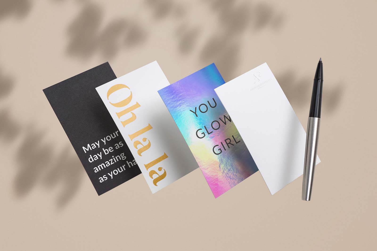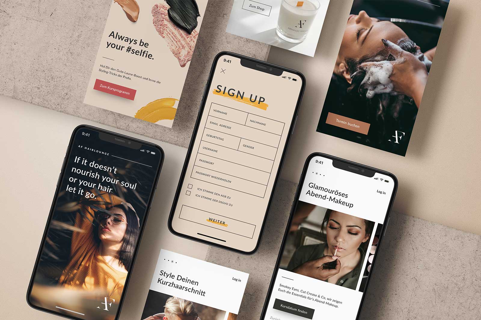 Modisch, elegant und hochwertig zeigt sich die Markenpräsenz auf den ersten Blick. Doch bietet das flexible Designsystem viel Spielraum für Spannungsfelder, welche die klassische Designsprache aufbrechen und mit viel Sympathie zukünftige Trends, die persönliche, kosmopolitische Note und auch eine Prise Humor kommunizieren können. Dies bildet die Basis für den gestärkten Medienauftritt und die vielen kleinen Good Vibe Reminder, die im Alltag der Kunden platziert werden. Style-Tutorials auf Youtube und individuelle Onlinekurse lassen die Grenzen zwischen Salon und eigenem Zuhause ebenso verschwimmen, wie die veredelten Grußkarten oder die Duftkerzen und nachhaltig produzierten Produkte in ihren nachfüllbaren Glasflaschen im Amber Look. Die vernetzten Kommunikationskanäle werden so multisensorisch und stets mit Attitude aufgebaut.